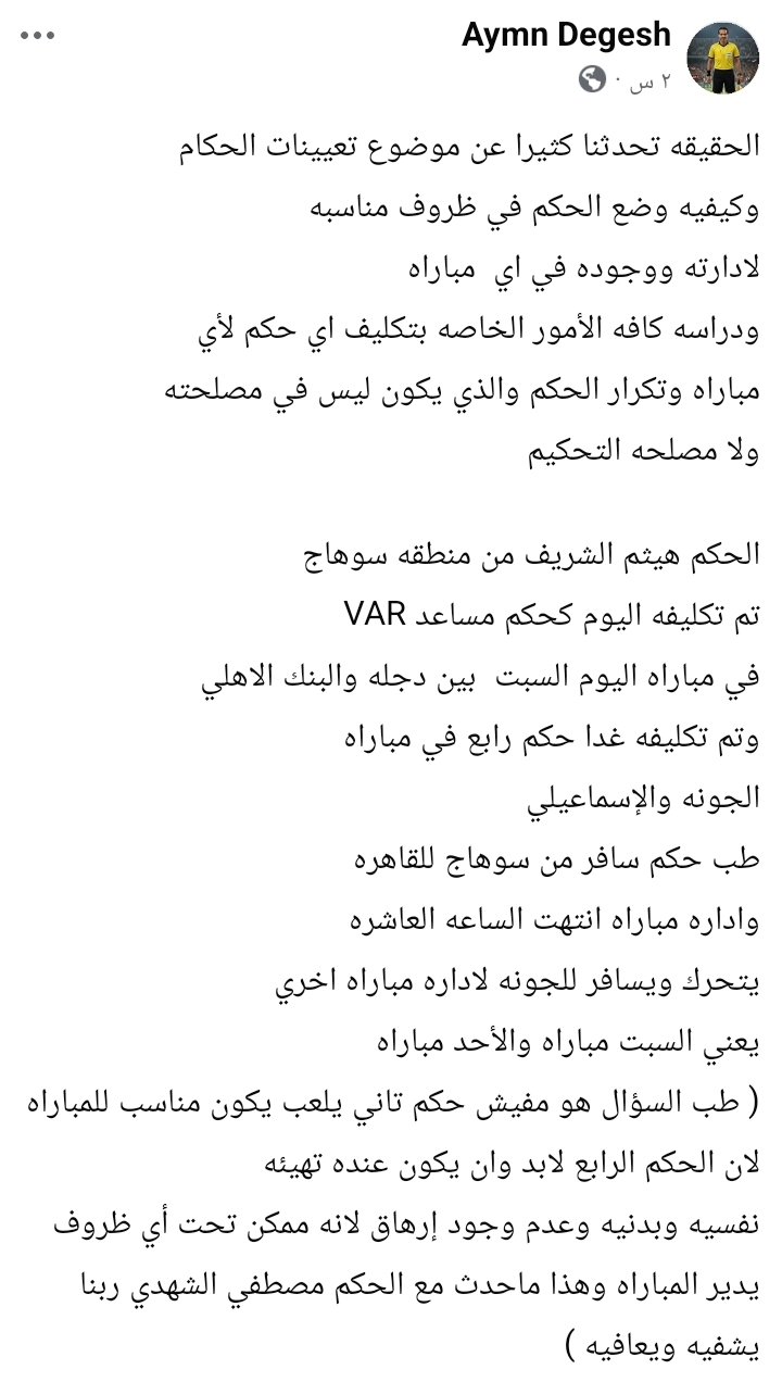 وأشار إلى تكليف الحكم هيثم الشريف من محافظة سوهاج بمهمتين متتاليتين، حيث تم تعيينه اليوم مساعدًا لحكم تقنية الفيديو (VAR) في مباراة بين وادي دجلة والبنك الأهلي، على أن يتم تكليفه غدًا حكمًا رابعًا في مباراة الجونة والإسماعيلي، متسائلًا عن جدوى هذا الضغط الناتج عن التنقل والإجهاد خلال يومين متتاليين.