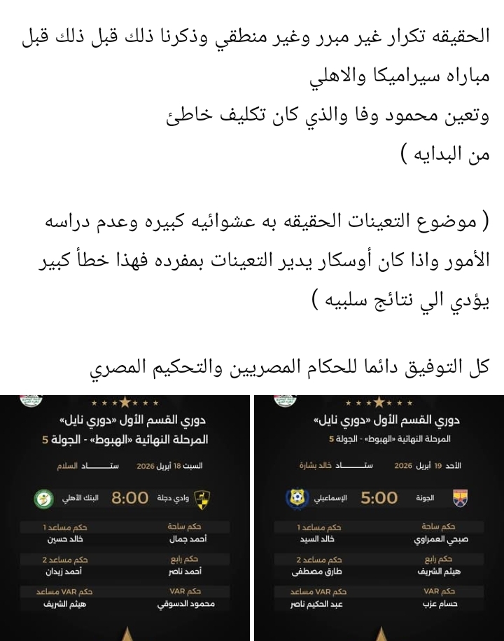 واعتبر دجيش أن تكرار مثل هذه القرارات يعكس، بحسب وصفه، عشوائية في إدارة ملف التعيينات، محذرًا من أن استمرار هذا النهج قد ينعكس سلبًا على مستوى التحكيم.