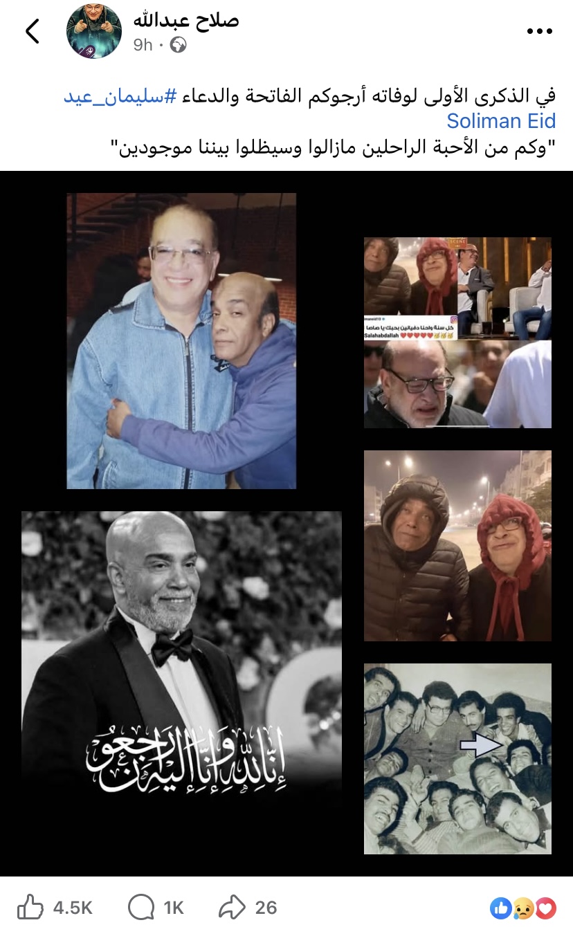 “في الذكرى الأولى لوفاته أرجوكم الفاتحة والدعاء لسليمان عيد.. وكم من الأحبة الراحلين ما زالوا وسيظلون بيننا موجودين”.