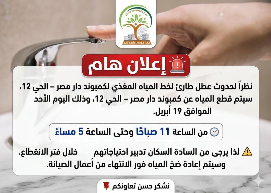 أعلن جهاز مدينة الشيخ زايد عن قطع المياه عن كمبوند دار مصر – الحي 12، وذلك نتيجة حدوث عطل طارئ بخط المياه المغذي للمنطقة.