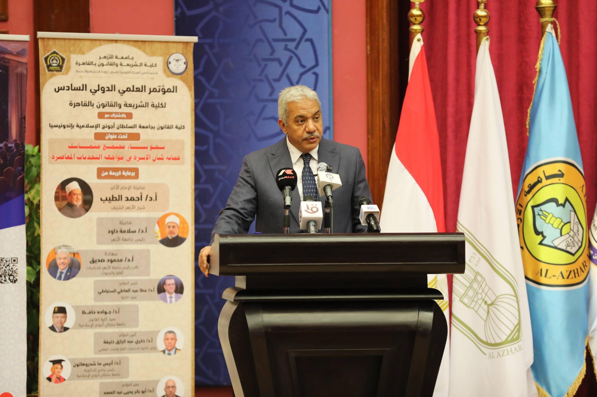 جاء ذلك خلال كلمته في افتتاح فعاليات المؤتمر العلمي الدولي السادس الذي تنظمه كلية الشريعة والقانون بالقاهرة بالاشتراك مع كلية القانون بجامعة السلطان أجونج الإسلامية بإندونيسيا تحت عنوان: «نحو بناء مجتمع متماسك حماية كيان الأسرة في مواجهة التحديات المعاصرة».