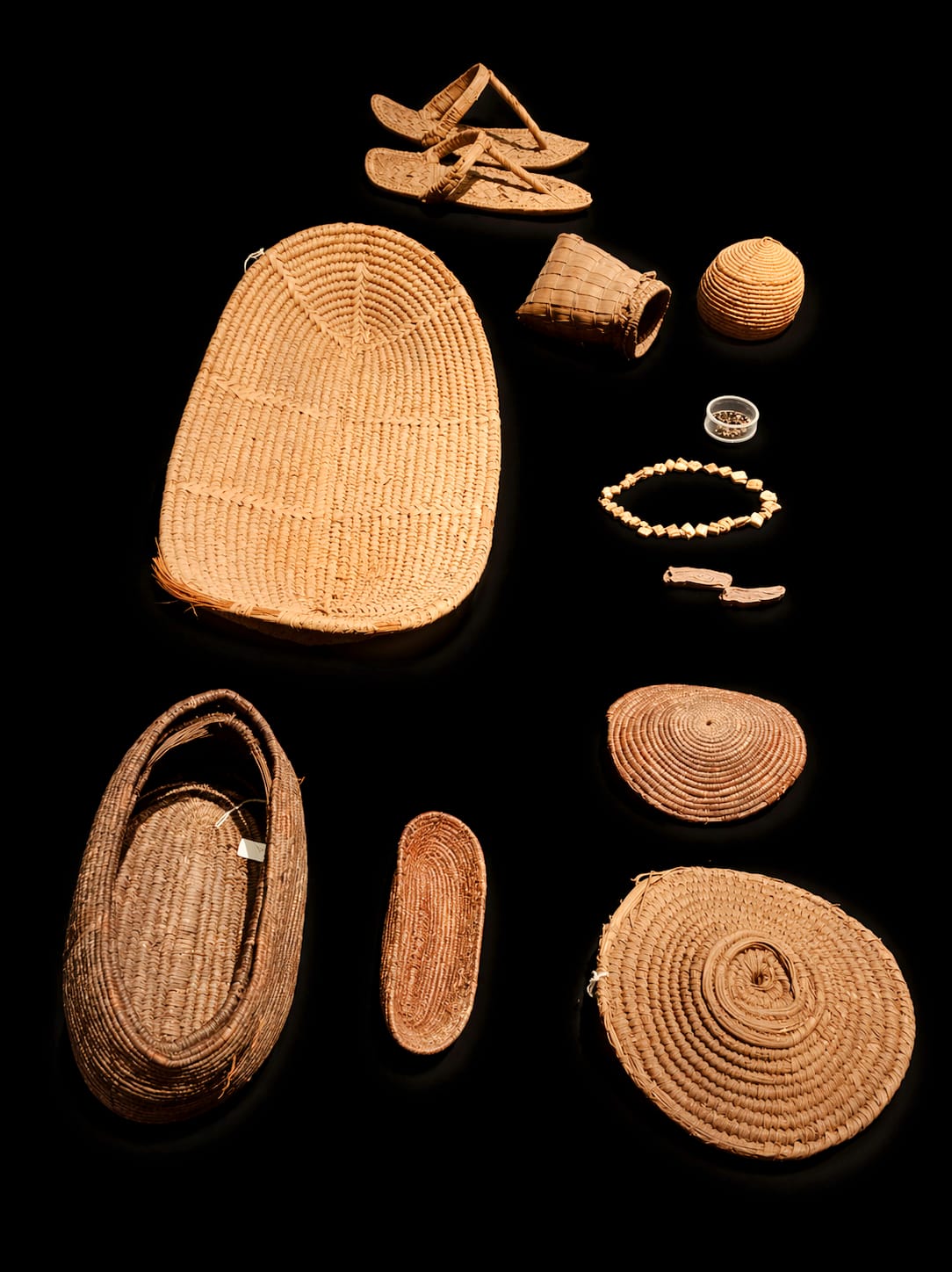 وأضاف أنه من بين المعروضات كرسي بدون مسند، جرة فخارية مزودة بحبل، زوج من الصنادل المصنوعة من خوص النخيل المجدول، سلال مجدولة بأشكال مختلفة، منها أسطواني الشكل مزود بحبل للتعليق وأخرى بغطاء محكم، بالإضافة إلى بكرة خشبية بحبل، وحبات من ثمار حب العزيز، وعقد من الخوص من منطقة ذراع أبو النجا، إلى جانب ثمرتي بلح ومجموعة من السلال والأغطية المصنوعة من الخوص.