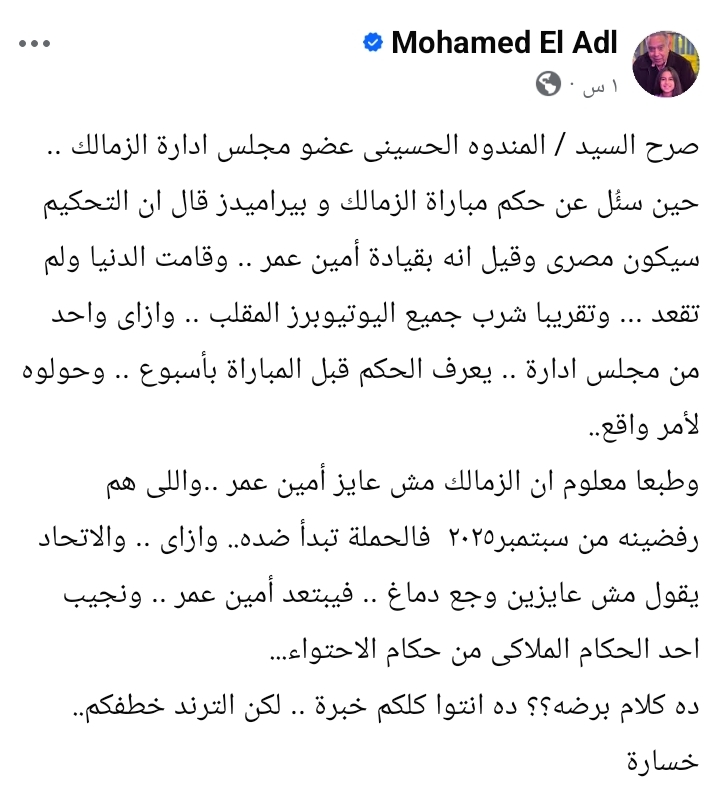 وأوضح العدل عبر حسابه على «فيسبوك»، أن تصريحات المندوه الحسيني بشأن هوية حكم اللقاء تم تضخيمها بشكل كبير، رغم أنها لم تكن مؤكدة، مشيرًا إلى أن الحديث عن إسناد المباراة للحكم أمين عمر تسبب في موجة جدل واسعة.
