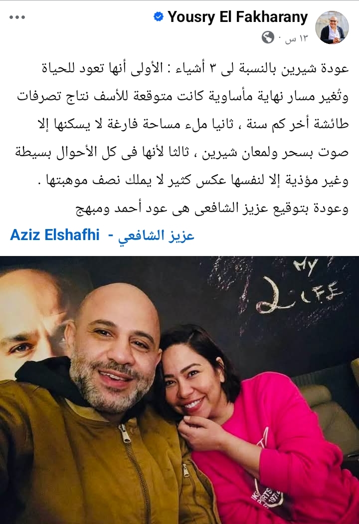 علق الإعلامي يسري الفخراني على عودة الفنانة شيرين عبدالوهاب، بعد ظهورها في الاستوديو أثناء تسجيل أغنية جديدة مع عزيز الشافعي.، مؤكدًا أنها تمثل بالنسبة له ثلاثة أمور أساسية، أولها أنها تعود للحياة وتغير مسار نهاية مأساوية كانت متوقعة نتيجة تصرفات وصفها بالطائشة خلال السنوات الأخيرة.