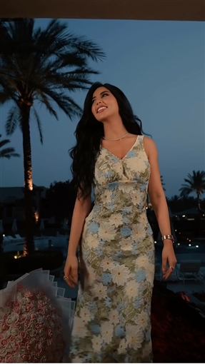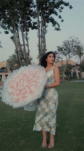 كما ظهرت في بعض اللقطات وهي تمسك باقة ورد كبيرة باللونين الزهري والأبيض، بينما تألقت في صور أخرى بباقة ورود حمراء أضفت لمسة رومانسية على الجلسة.