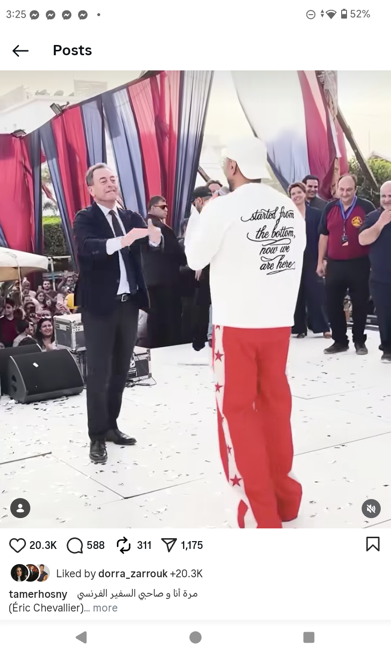 تغنينا بنت الإيه مع بعض على مسرح واحد أنا حاسس إن البوست اللي جاي هكون بعلن عن أول سنجل دويتو أنا ومعالي السفير الفرنسي و شرفتني يا صاحبي العزيز "