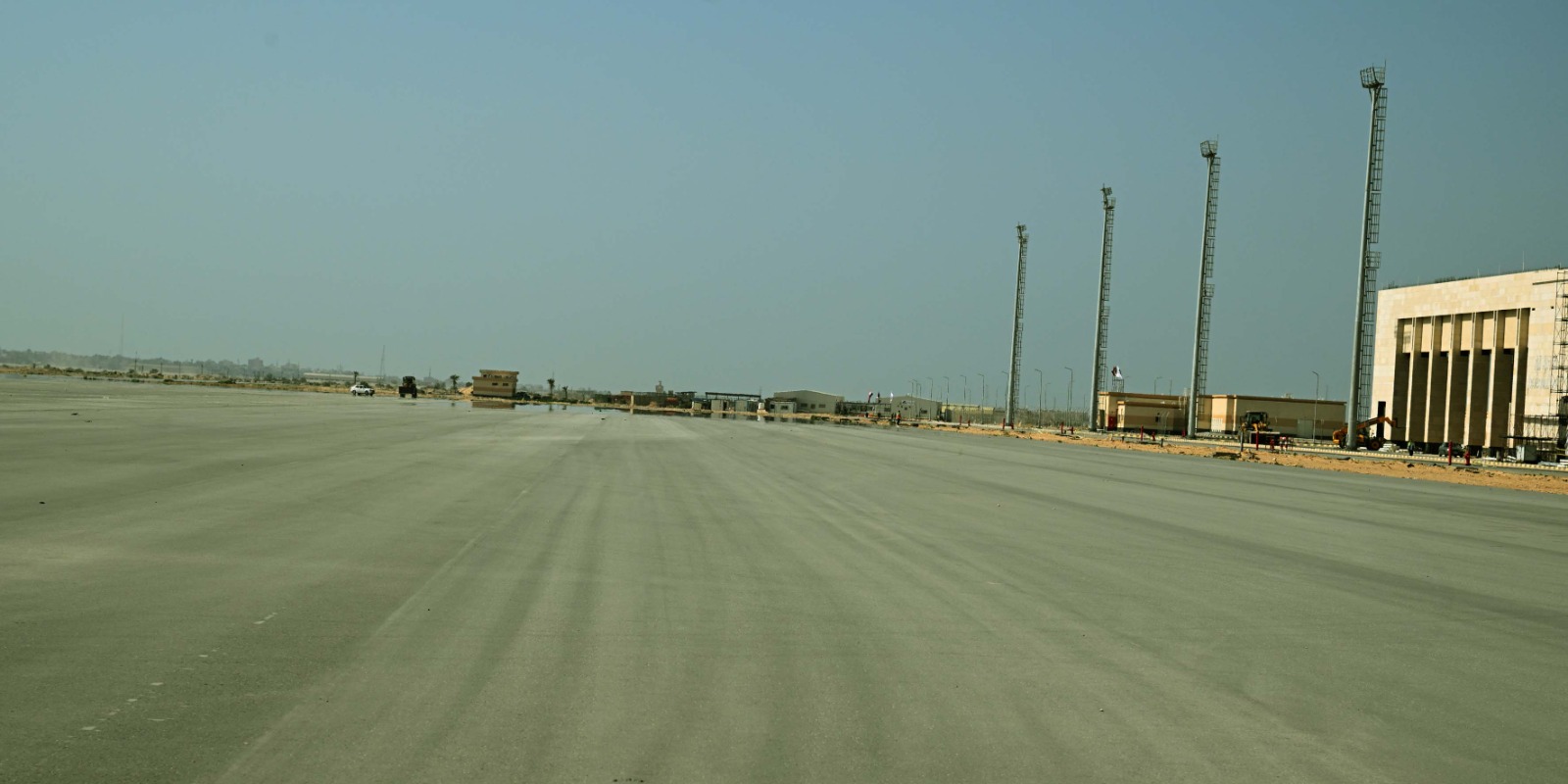 وقدم اللواء أحمد سرور شرحا حول الطرق التي يشملها المشروع، موضحا أنه يوجد (ممر رئيسي بطول 3 كيلو مترات وعرض 45 مترا – ممر مساعد بطول 3 كيلو مترات وعرض 30 مترا – وصلات بطول 1 كيلو متر – ترمك رئيسي بمسطح 86892 مترا مربعا يسع عدد 10 طائرات تصميمية (A-320) - طرق خدمة بطول 14.6 كيلو متر)، وذلك بإجمالي حقل طيران بمسطح 480.000 متر مربع.