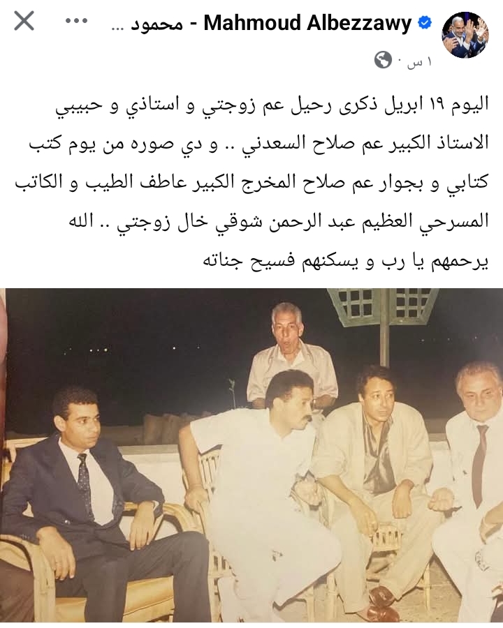 ونشر محمود البزاوي عبر حسابه على موقع «فيسبوك» صورة نادرة تجمعه بالراحل، وكتب: «اليوم 19 أبريل ذكرى رحيل عم زوجتي وأستاذي وحبيبي الأستاذ الكبير عم صلاح السعدني.. ودي صورة من يوم كتب كتابي وبجواره المخرج الكبير عاطف الطيب والكاتب المسرحي العظيم عبد الرحمن شوقي خال زوجتي.. الله يرحمهم يا رب ويسكنهم فسيح جناته».