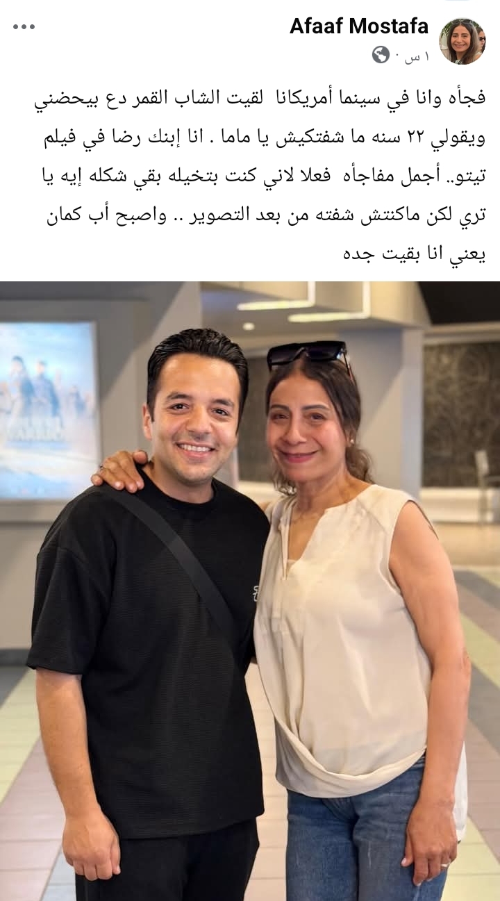 وأوضحت عفاف مصطفى عبر حسابها علي فيسبوك "أنها فوجئت بشاب وسيم يقترب منها ويحتضنها، قائلاً: "22 سنة ما شفتكيش يا ماما.. أنا ابنك رضا في فيلم تيتو"، في إشارة إلى الفيلم الشهير تيتو.