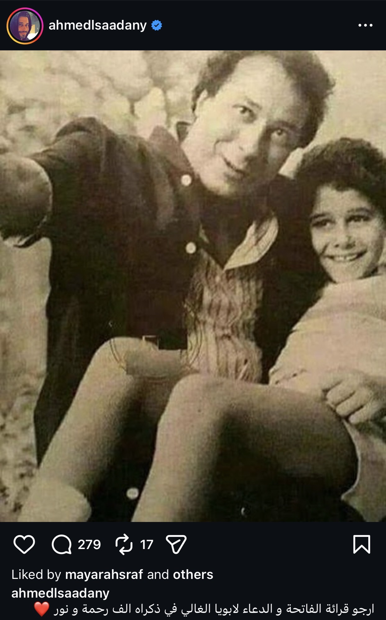 وطلب أحمد السعدني من جمهوره الدعاء لوالده، حيث كتب: “أرجو قراءة الفاتحة والدعاء لأبويا الغالي في ذكراه.. ألف رحمة ونور عليه”، في رسالة مؤثرة لاقت تفاعلًا واسعًا من المتابعين.