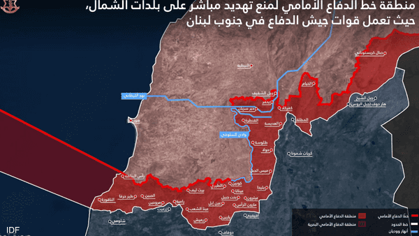 وقال الجيش في بيان مصاحب للخريطة "تعمل 5 فرق، إلى جانب قوات البحرية الإسرائيلية، في وقت واحد إلى الجنوب من خط الدفاع الأمامي في جنوب لبنان، بهدف تفكيك مواقع البنية التحتية الإرهابية التابعة لحزب الله ومنع أي تهديدات مباشرة للمناطق السكنية في شمال إسرائيل".