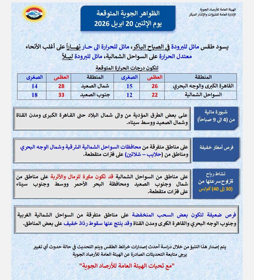 تابعت أن فرص ضعيفة لتكون بعض السحب المنخفضة على مناطق متفرقة من السواحل الشمالية الغربية وجنوب الوجه البحري والقاهرة الكبري ومدن القناة وقد ينتج عنها سقوط رذاذ خفيف على بعض المناطق.