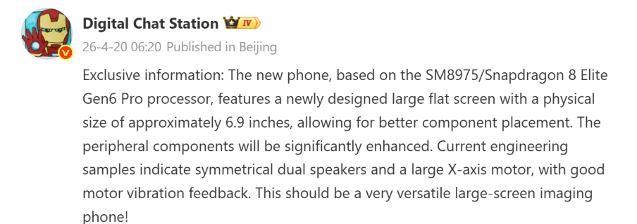 بحسب المُسرّب، من المتوقع أن يُطرح هاتف ذكي رائد قادم مزود بشريحة كوالكوم SM8975 من الجيل التالي، ويُسوّق باسم سنابدراجون 8 إيليت جين 6 برو . ورغم أنه لم يُحدد اسم الجهاز، إلا أنه يبدو أنه قد يكون شاومي 18 برو ماكس . ويُقال إن الجهاز يتميز بشاشة مسطحة كبيرة بحجم 6.9 بوصة تقريبًا، مما يُتيح مساحة أكبر للمكونات الداخلية المتطورة.