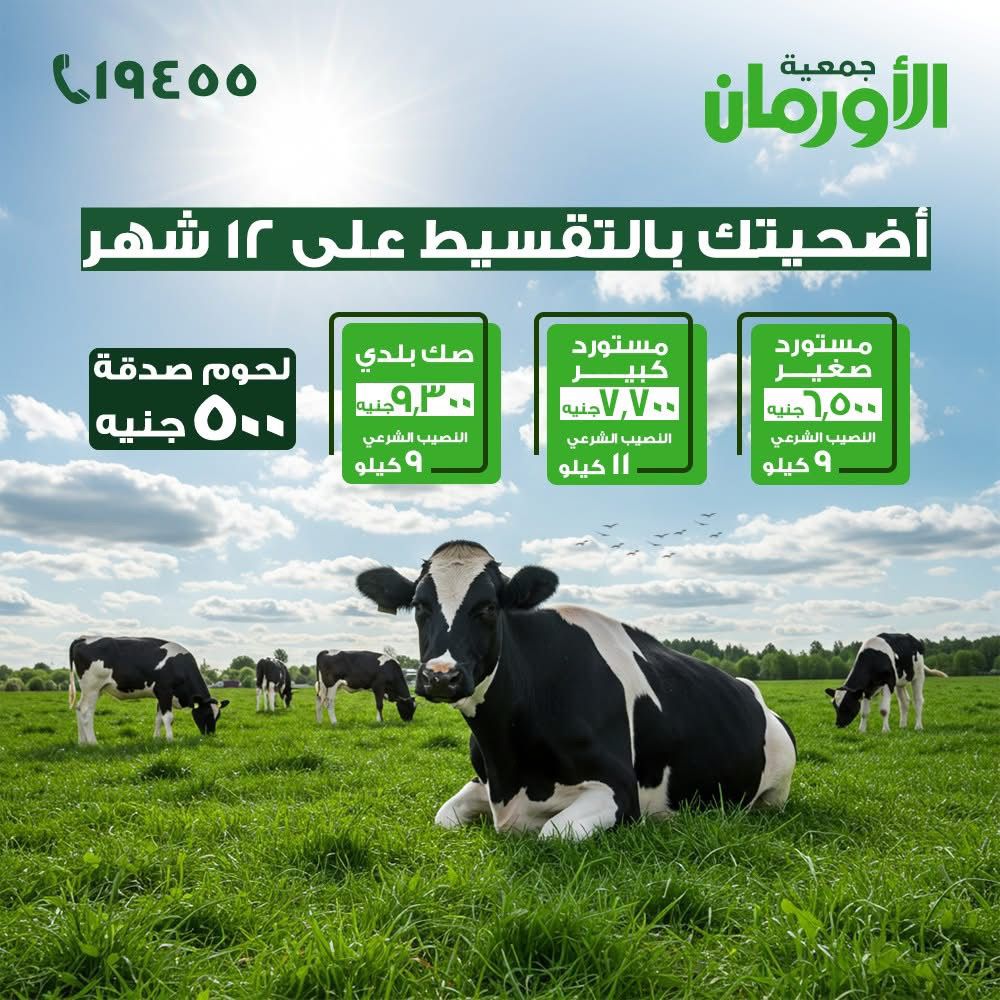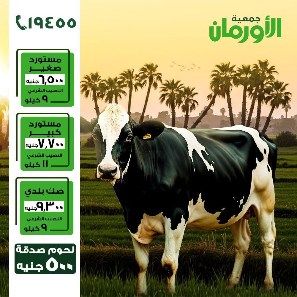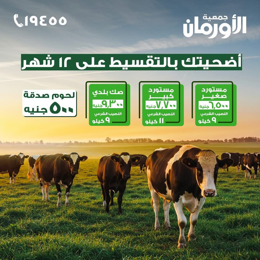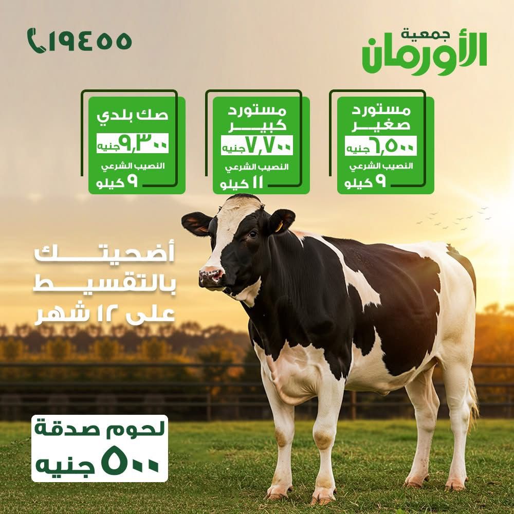 وأعلن اللواء ممدوح شعبان، مدير عام جمعية الأورمان، قيمة صكوك الأضاحى من جمعية الأورمان لهذا العام 2026 حيث بلغت قيمة الصك فى العجل المستورد الصغير 6500 جنيه، والصك بقيمة 7700 جنيه للعجل المستورد الكبير، وقيمة الصك 9300 جنيه فى العجل البلدى، او يمكن تقسيط قيمة الصك على 12قسط، كما تقوم أيضا الجمعية بتوزيع لحوم صدقة بقيمة 500 جنيه وذلك لتوفير أكبر كمية من اللحوم.