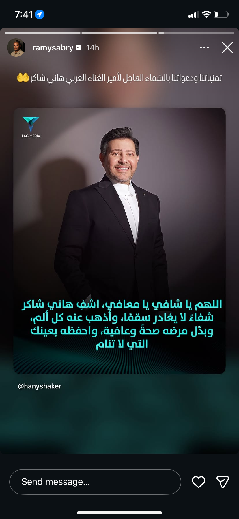 وكتب رامي صبري عبر صفحته الرسمية على "إنستجرام"، قائلاً: "تمنياتنا ودعواتنا بالشفاء العاجل لأمير الغناء العربي هاني شاكر”.