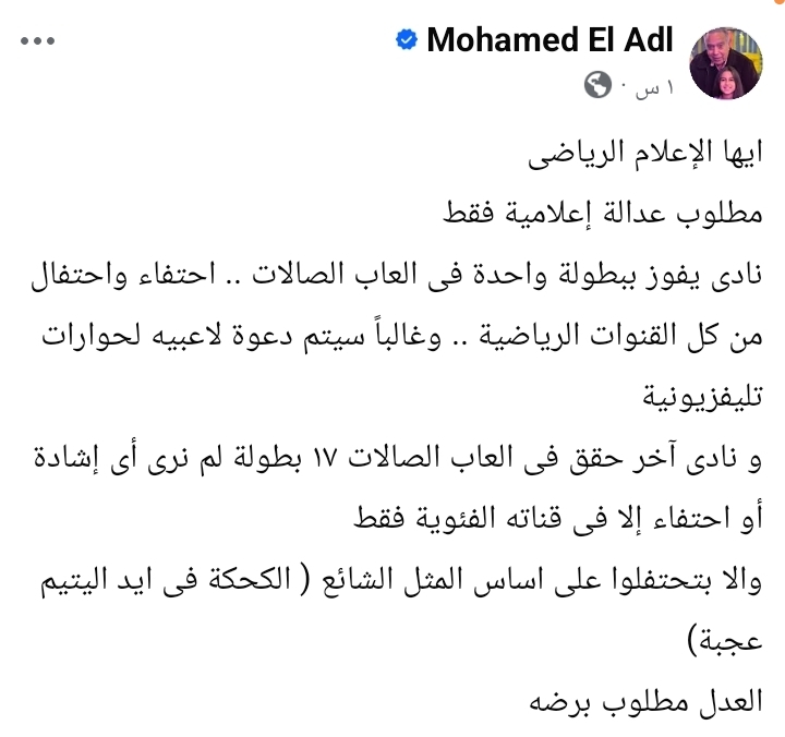 وأشار العدل عبر حسابه علي فيسبوك" إلى أن ناديًا يحقق بطولة واحدة يحظى باهتمام واسع من القنوات الرياضية، مع استضافة لاعبيه في البرامج التلفزيونية، بينما نادٍ آخر حقق 17 بطولة في ألعاب الصالات لا يجد نفس القدر من الإشادة أو التغطية، باستثناء قناته الخاصة.