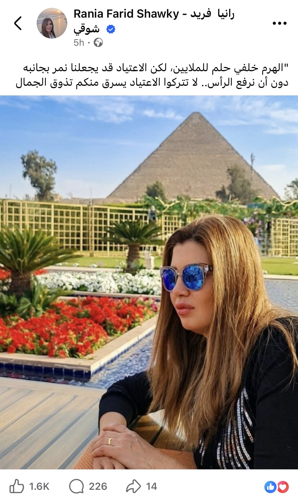 وكتبت رانيا فريد شوقي: “الهرم خلفي حلم للملايين، لكن الاعتياد قد يجعلنا نمر بجانبه دون أن نرفع الرأس.. لا تتركوا الاعتياد يسرق منكم تذوق الجمال”.