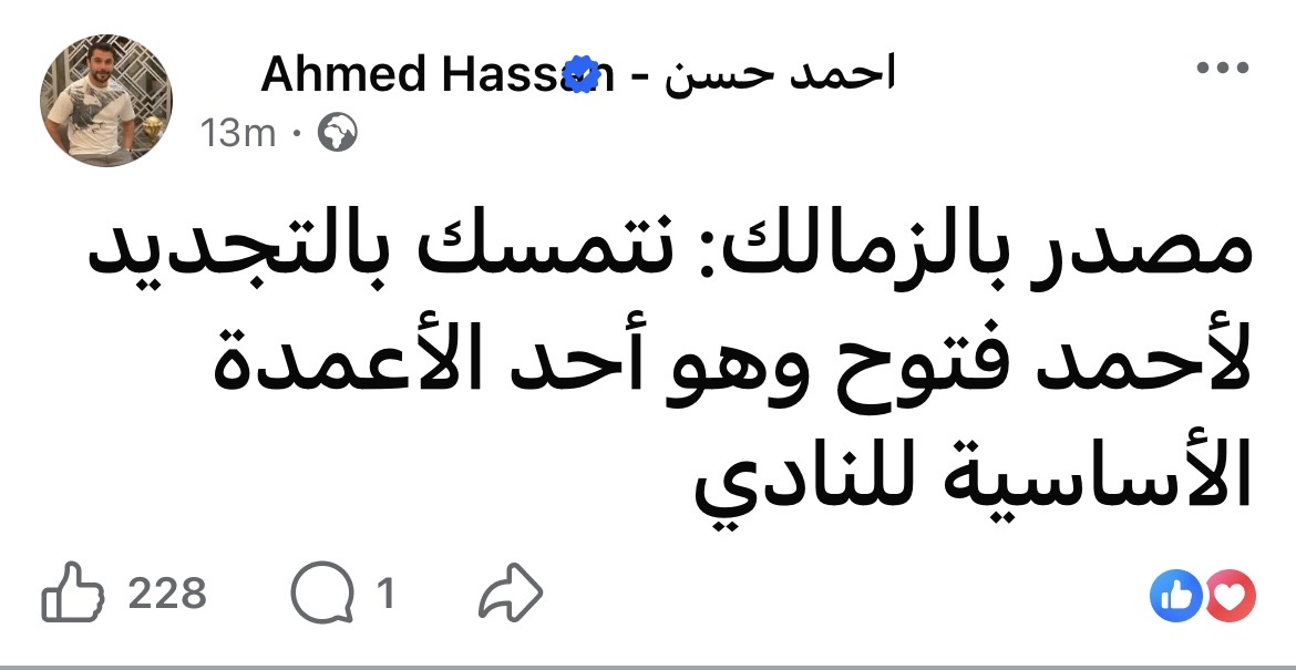 وكتب أحمد حسن عبر حسابه على فيسبوك: "الزمالك يتمسك بالتجديد لأحمد فتوح وهو أحد الأعمدة الأساسية للنادي".