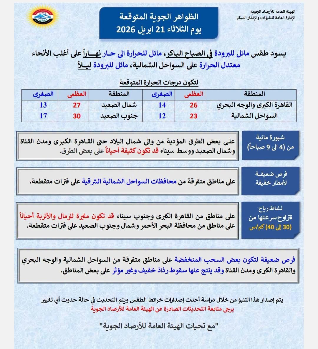 وأشارت إلى وجود فرص ضعيفة لأمطار خفيفة على مناطق متفرقة من محافظات السواحل الشمالية الشرقية على فترات متقطعة، بالإضافة إلى نشاط رياح تتراوح سرعتها من 30 إلى 40 كم، على مناطق من القاهرة الكبرى وجنوب سيناء قد تكون مثيرة للرمال والأتربة أحيانا على مناطق من محافظة البحر الأحمر وشمال وجنوب الصعيد على فترات متقطعة.