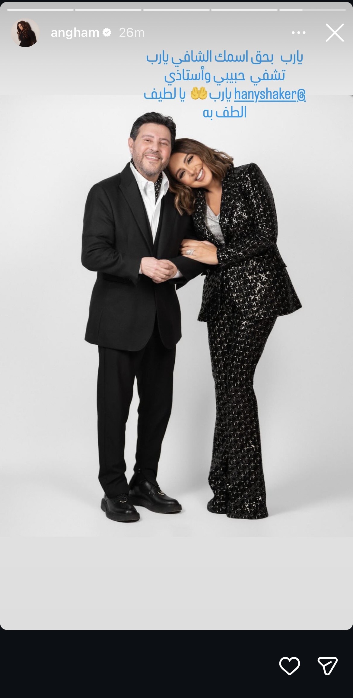 وكتبت أنغام عبر حسابها على موقع التواصل الاجتماعي للصور والفيديوهات انستجرام : “يارب بحق اسمك الشافي يارب تشفي حبيبي واستاذي يارب يا لطيف الطف بيه”.