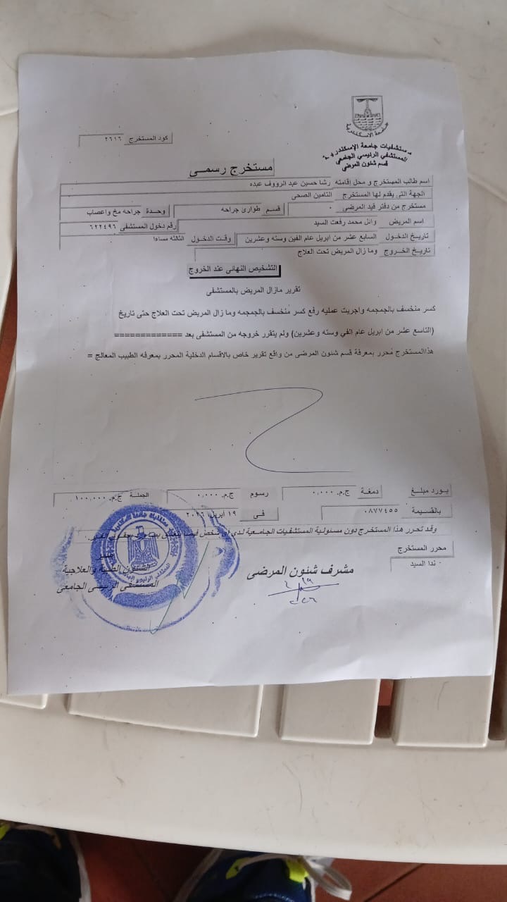 وأكد الأب أن حالة نجله كانت حرجة للغاية، مضيفًا: “الدكاترة قالولي عنده كسر في الجمجمة، ودخل عمليات من الساعة 7 لحد 11 ونص بالليل، وربنا كرمنا بدكاترة مخ وأعصاب، وقالولي إن ابني اتكتب له عمر جديد لأن الخبطة كانت خطيرة جدًا”.