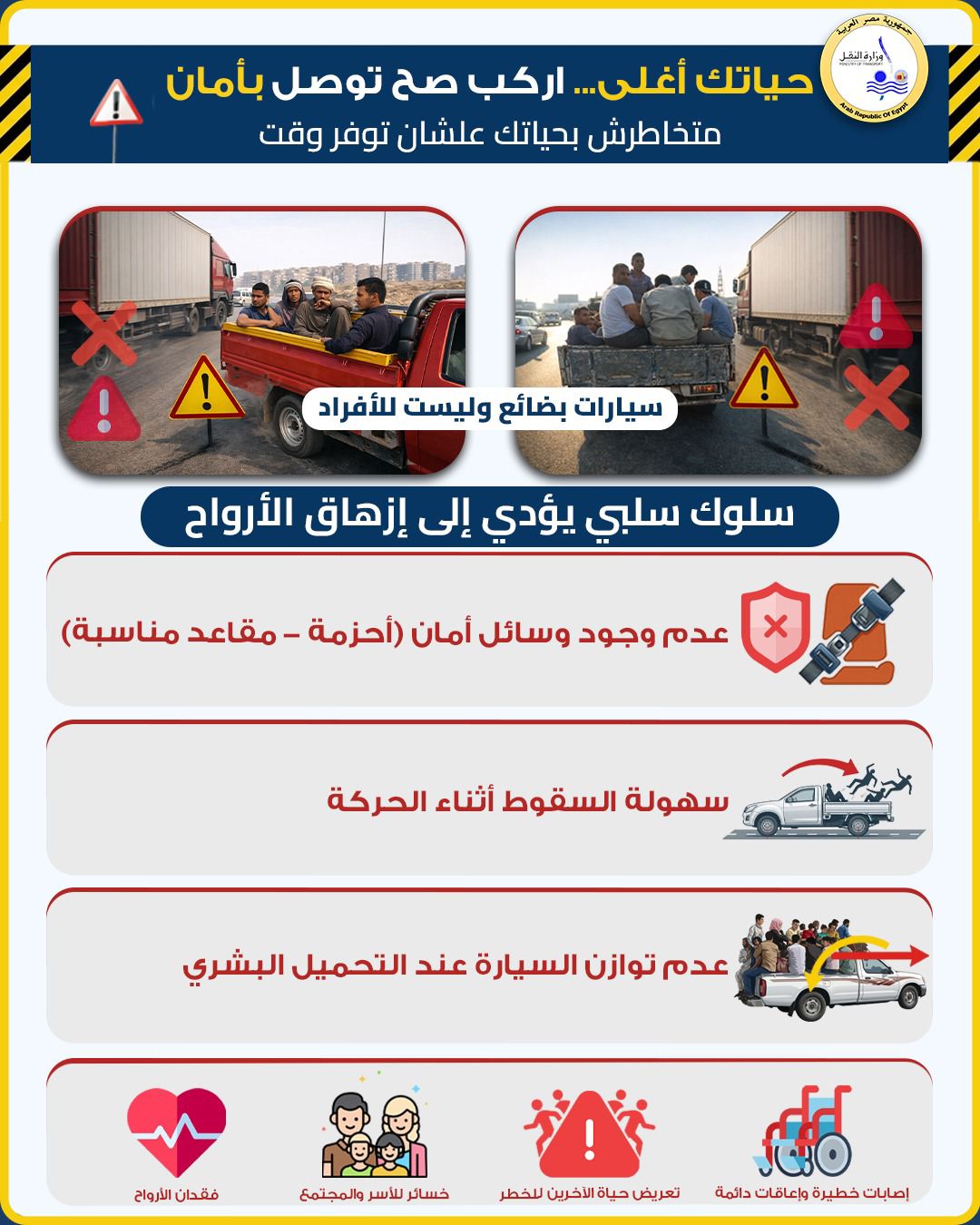 وأوضح بيان الوزارة أنه رغم الحملات الإعلامية المكثفة التي تنفذها الوزارة لتوعية السادة المواطنين من مخاطر السلوكيات السلبية التي يرتكبها عدد من مستخدمي وسائل النقل والمواصلات ومنها هذه الظاهرة الا أنه مازال عدد من مستخدمي الطرق المصرية يقومون باستقلال هذه النوعية من العربات التي تتسبب في تعرض حياتهم وحياة الاخرين للخطر خاصة، و أن تجمع الأفراد على هذه العربات، سواء بالوقوف أو الجلوس في أماكن غير آمنة، يزيد من احتمالية السقوط أثناء السير أو التعرض لإصابات خطيرة وقد تصل إلى فقدان للحياة في حال وقوع تصادم أو توقف مفاجئ للمركبات . كما أن هذه العربات تفتقر إلى وسائل الأمان الأساسية مثل المقاعد المخصصة وأحزمة الأمان، مما يضاعف حجم الخطر الناتج عن هذه الظاهرة السلبية الخطيرة.
