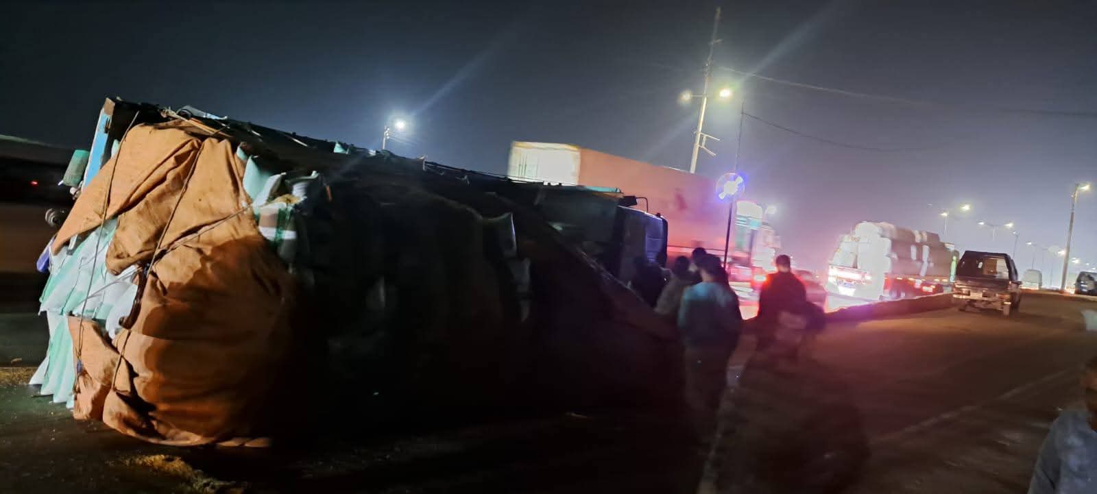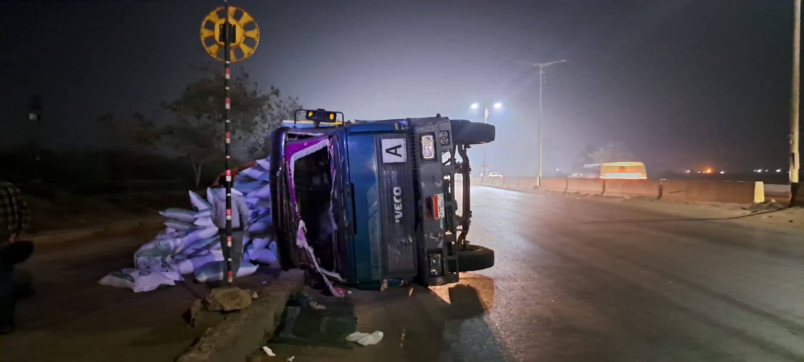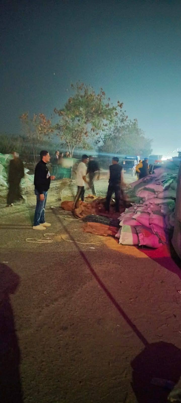 ويتم رفع آثار الحادث بعد سقوط الأعلاف على الطريق لتسيير حركة المرور.
