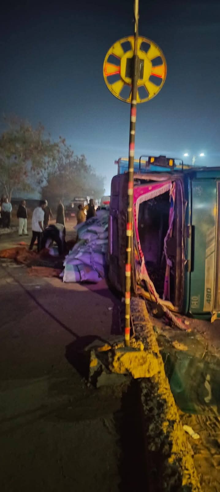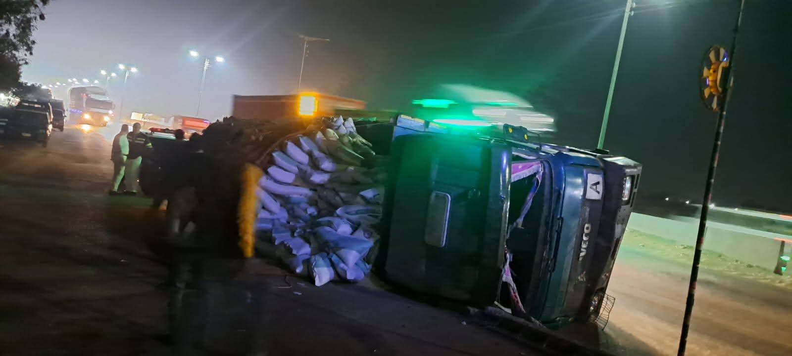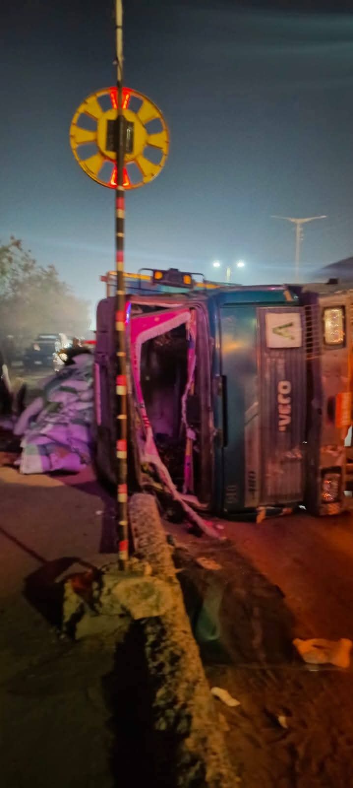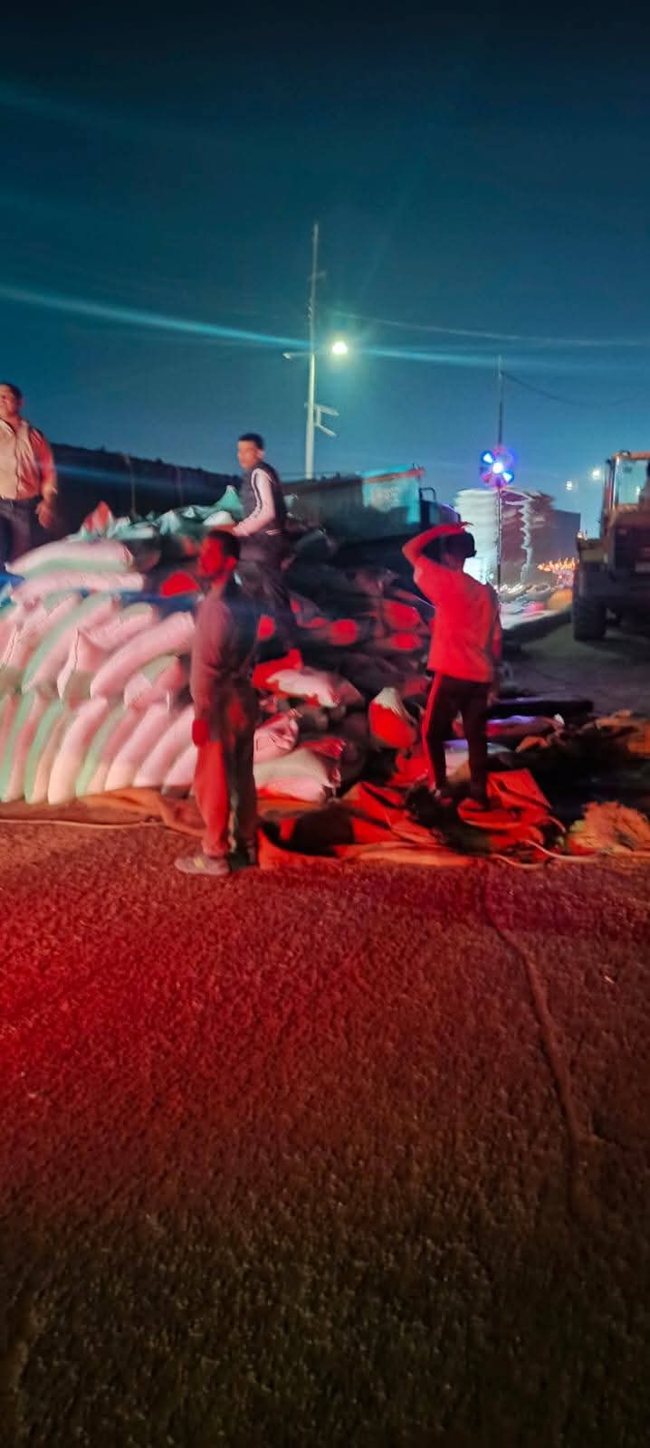 ويتم رفع آثار الحادث بعد سقوط الأعلاف على الطريق لتسيير حركة المرور.