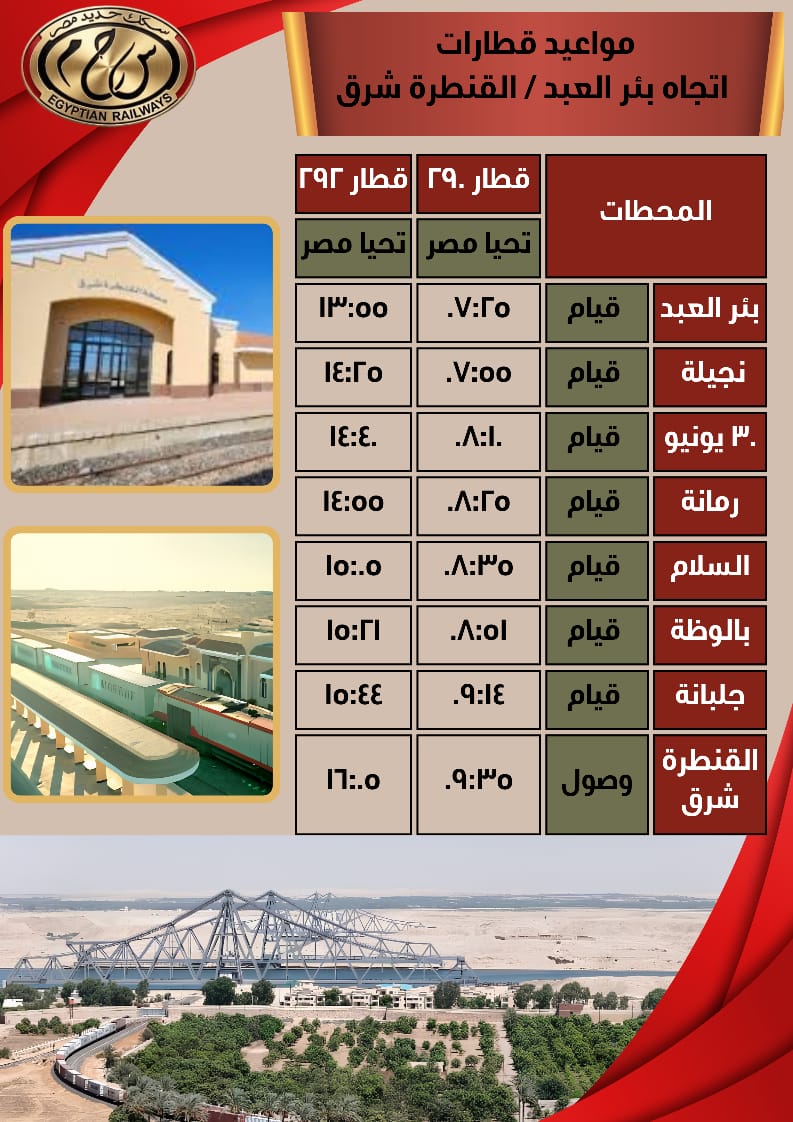 - قطار رقم 292 يقوم من محطة بئر العبد الساعة 13:55 مساءً ويصل محطة بالوظة الساعة 15:12 حيث يقابل القطار رقم 293 ويقوم منها الساعة 15:21 ليصل محطة القنطرة شرق الساعة 16:05 مساءً طبقا للجدول المرفق .