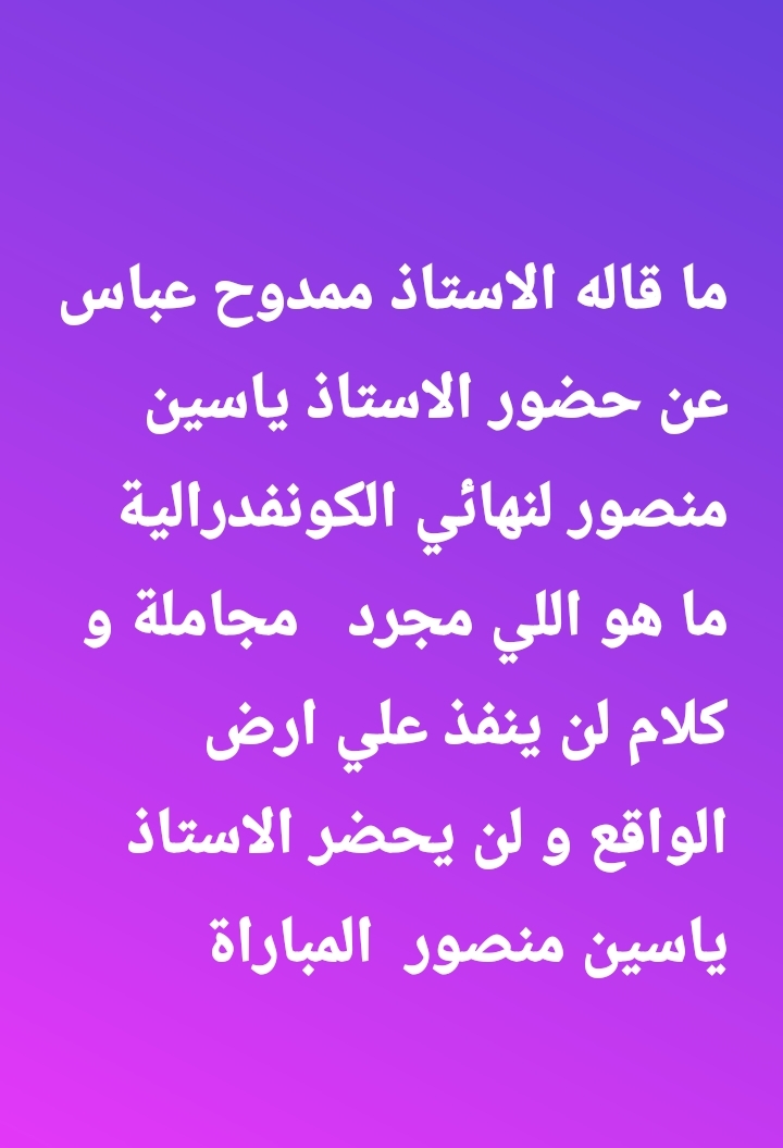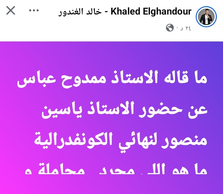 وكتب الغندور عبر حسابه علي فيسبوك "ما قاله الاستاذ ممدوح عباس عن حضور الاستاذ ياسين منصور لنهائي الكونفدرالية ما هو اللي مجرد مجاملة و كلام لن ينفذ علي ارض الواقع و لن يحضر الاستاذ ياسين منصور المباراة".