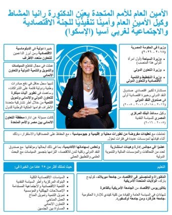 أعلن أنطونيو جوتيريش، الأمين العام للأمم المتحدة، تعيين الدكتورة رانيا المشاط في منصب وكيل الأمين العام والأمين التنفيذي الجديد للجنة الأمم المتحدة الاقتصادية والاجتماعية لغربي آسيا (الإسكوا).