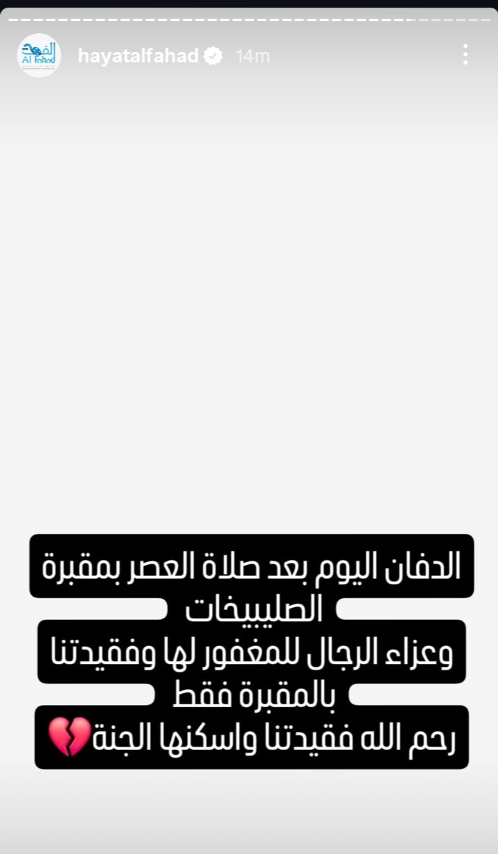 أعلنت مؤسسة الفهد للإنتاج الفني الصفحة الرسمية للفنانة حياة الفهد موعد و مكان العزاء من خلال ستوري " اليوم بعد صلاة العصر بمقبرة الصليبيخات و عزاء الرجال للمغفور لها بالمقبرة فقط في دولة الكويت".