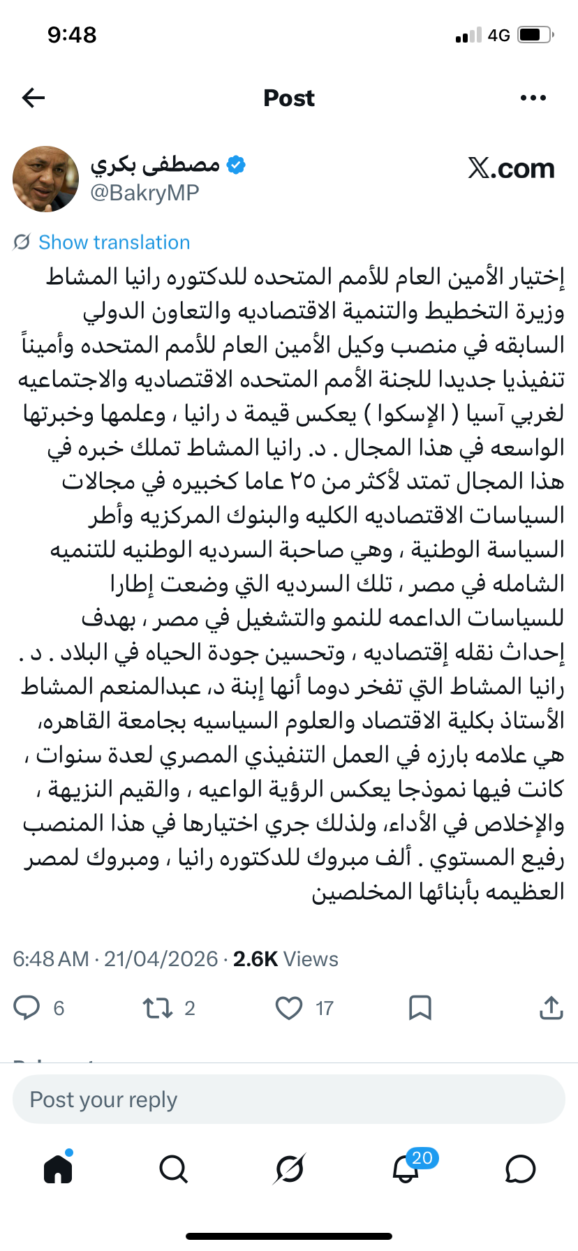 و علق النائب مصطفى بكري عضو مجلس النواب عبر حسابه بمنصة اكس :"إختيار الأمين العام للأمم المتحده للدكتورة رانيا المشاط وزيرة التخطيط والتنمية الاقتصادية والتعاون الدولي السابقة في منصب وكيل الأمين العام للأمم المتحده وأميناً تنفيذيا جديدا للجنة الأمم المتحده الاقتصاديه والاجتماعيه لغربي آسيا ( الإسكوا ) يعكس قيمة د رانيا ، وعلمها وخبرتها الواسعة في هذا المجال".