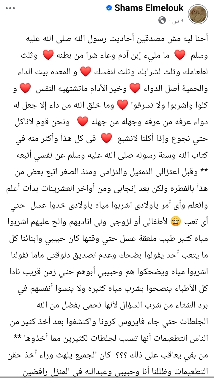 وقالت: "احنا ليه مش مصدقين أحاديث رسول الله صلى الله عليه وسلم، ما ملئ ابن آدم وعاء شرا من بطنه، ثلث لطعامه وثلث لشرابه وثلث لنفسه، والمعدة بيت الداء والحمية أصل الدواء، وخير الأدام ما تشتهيه النفس، وكلوا واشربوا ولا تسرفوا، وما خلق الله من داء إلا جعل له دواء عرفه من عرفه وجهله من جهله، ونحن قوم لا نأكل حتى نجوع وإذا أكلنا لا نشبع.