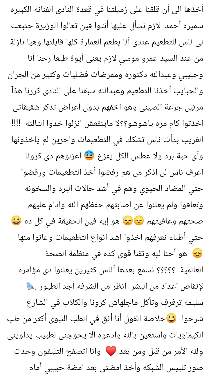 وأضافت أنها تلقت الجرعات، مشيرة إلى أن الجرعة الصينية كانت أخف من حيث الأعراض، لافتة إلى أن الجدل حول اللقاحات استمر بين مؤيد ومعارض، في ظل تجارب مختلفة للناس، بعضهم تلقى اللقاح وآخرون رفضوه وتعافوا من أعراض مرضية دون الإفصاح عنها.
