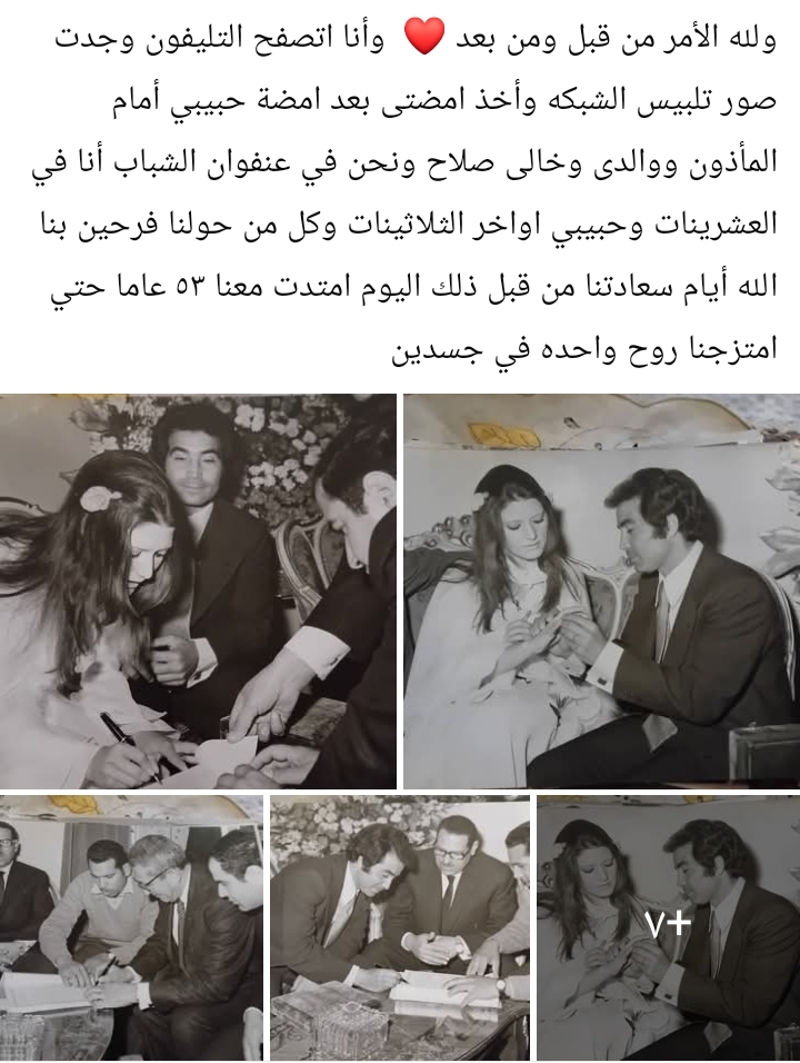 كما استعادت ذكريات زواجها من الراحل حسن يوسف، مشيرة إلى لحظات الارتباط الأولى بحضور المأذون وأسرتها، مؤكدة أن حياتها الزوجية امتدت لأكثر من 53 عامًا من التفاهم والمحبة، ووصفتها بأنها "روح واحدة في جسدين"، في رسالة جمعت بين التأملات الشخصية والآراء الصحية.