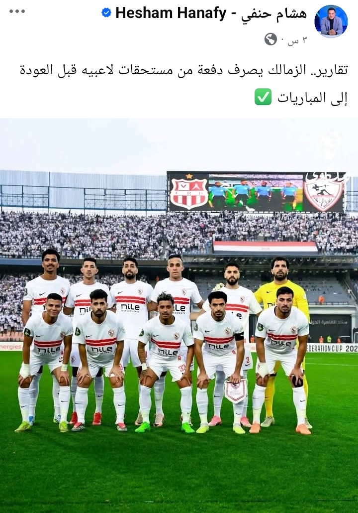 وكتب حنفي عبر حسابه على موقع التواصل الاجتماعي «فيسبوك»:"تقارير.. الزمالك يصرف دفعة من مستحقات لاعبيه قبل العودة إلى المباريات"
