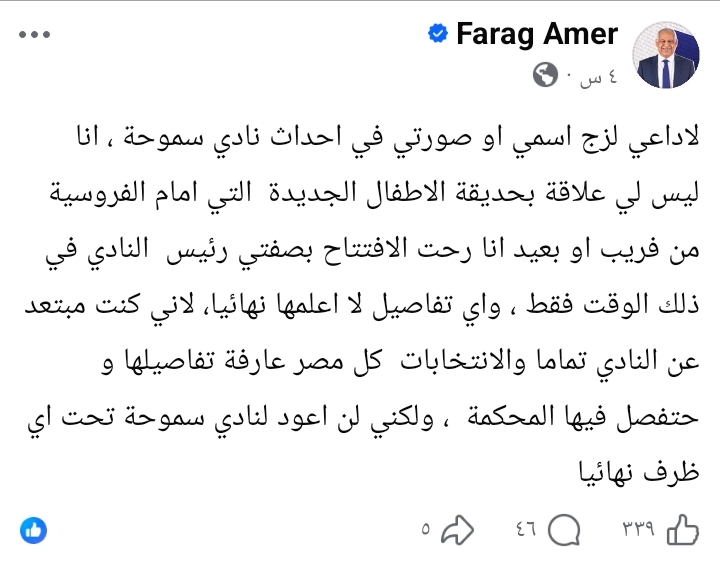 أكد المهندس فرج عامر، رئيس نادي سموحة السابق، عدم علاقته بالأحداث الجارية داخل النادي، مطالبا بعدم الزج باسمه أو صورته فيما يحدث حاليا.