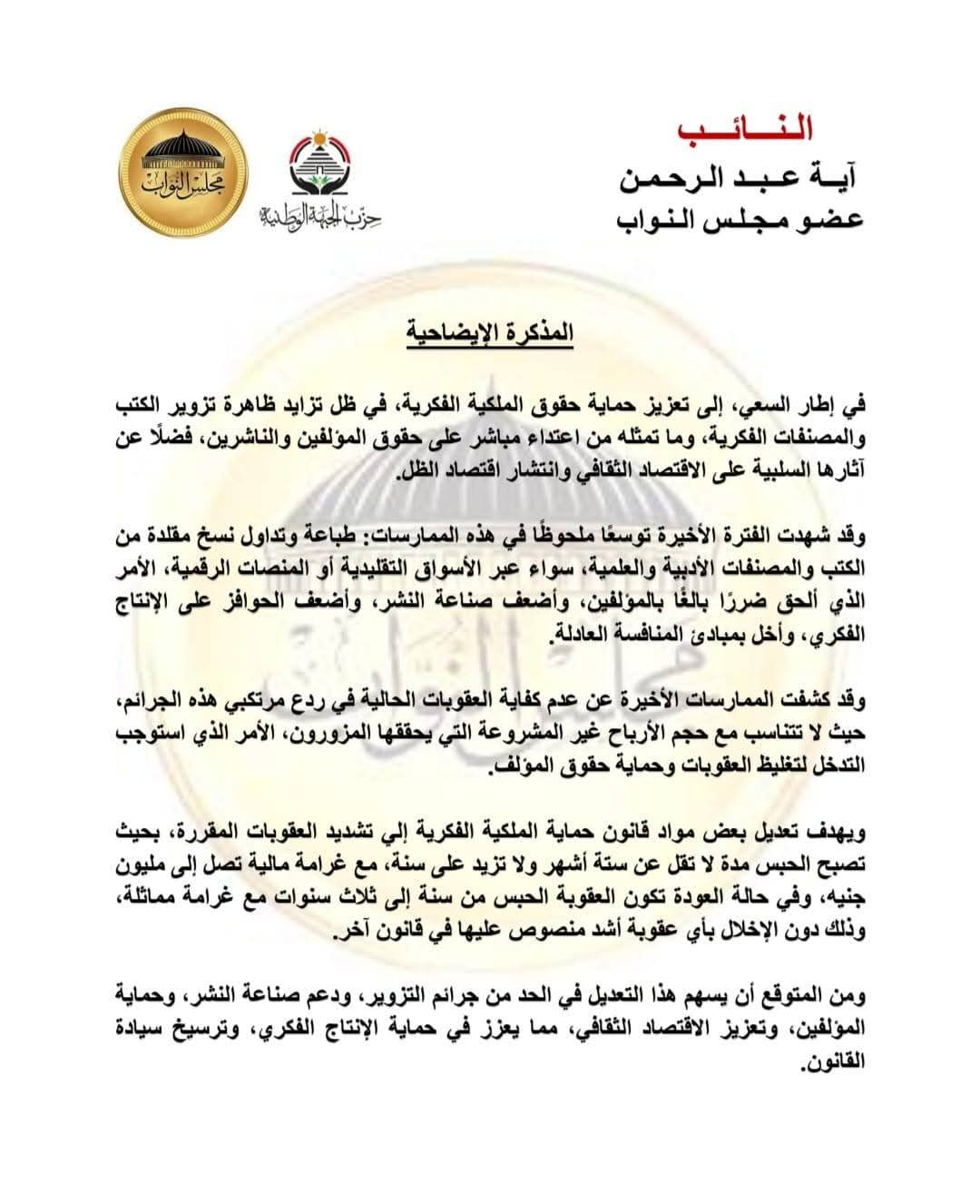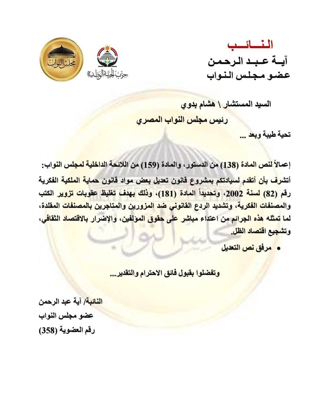 تقدمت النائبة آية عبد الرحمن، عضو لجنة الثقافة والإعلام بمجلس النواب، بمشروع قانون بتوقيع 60 عضوًا من مجلس النواب، أي بما يتجاوز عشر أعضاء المجلس، لتعديل بعض أحكام القانون رقم 82 لسنة 2002 بشأن حماية حقوق الملكية الفكرية، وذلك في إطار مواجهة ظاهرة تزوير الكتب ودعم صناعة النشر في مصر، والحفاظ على الاقتصاد الثقافي المصري.