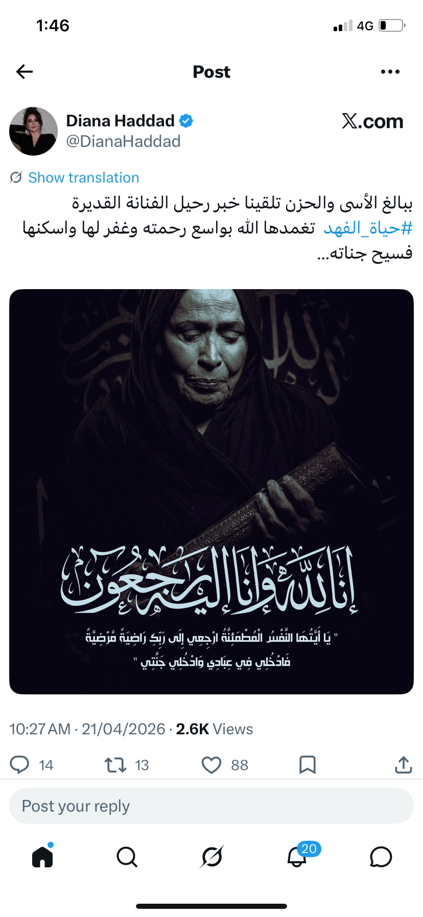 وكتبت ديانا، عبر حسابها الرسمي على منصة "إكس" قائلة: "ببالغ الأسى والحزن تلقينا خبر رحيل الفنانة القديرة حياة الفهد تغمدها الله بواسع رحمته وغفر لها وأسكنها فسيح جناته".