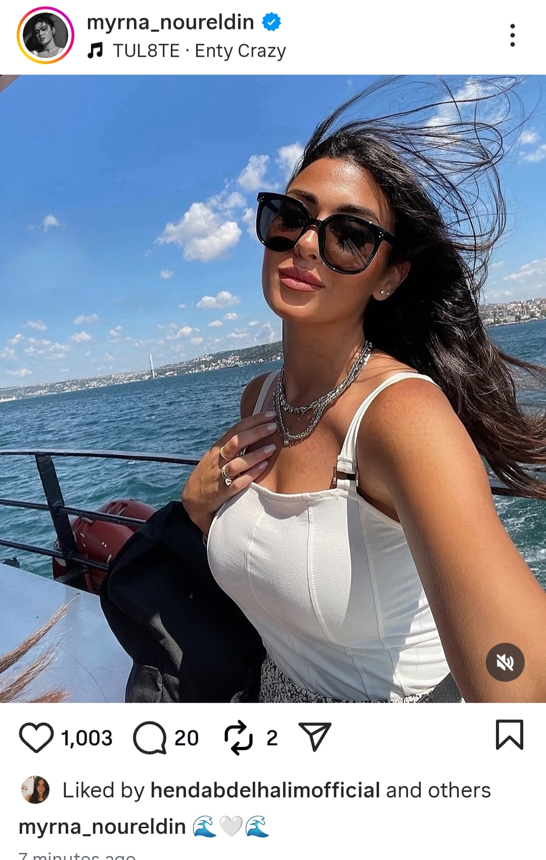 وخطفت ميرنا نور الدين الأنظار بإطلالة صيفية علي اليخت مرتدية بلوزة باللون الأبيض، وحازت الصورة علي إعجاب متابعيها.
