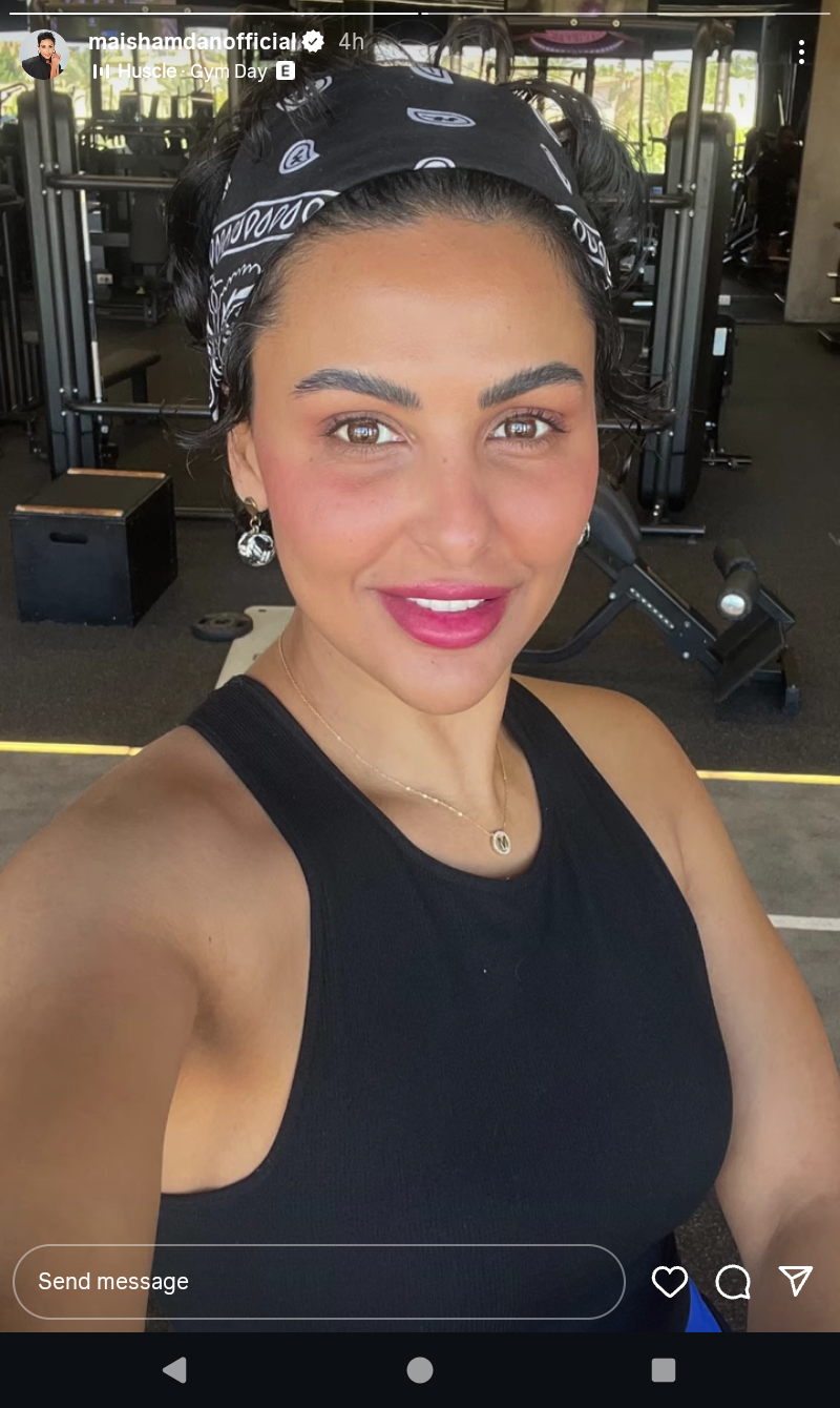 وظهرت ميس حمدان في الصور بإطلالة رياضية، من داخل الجيم أثناء مرانها اليومي، كما أبرزت رشاقتها من خلالها، ونالت الصور إعجاب متابعهيا وتفاعلوا معاها بوضع القلوب الحمراء.