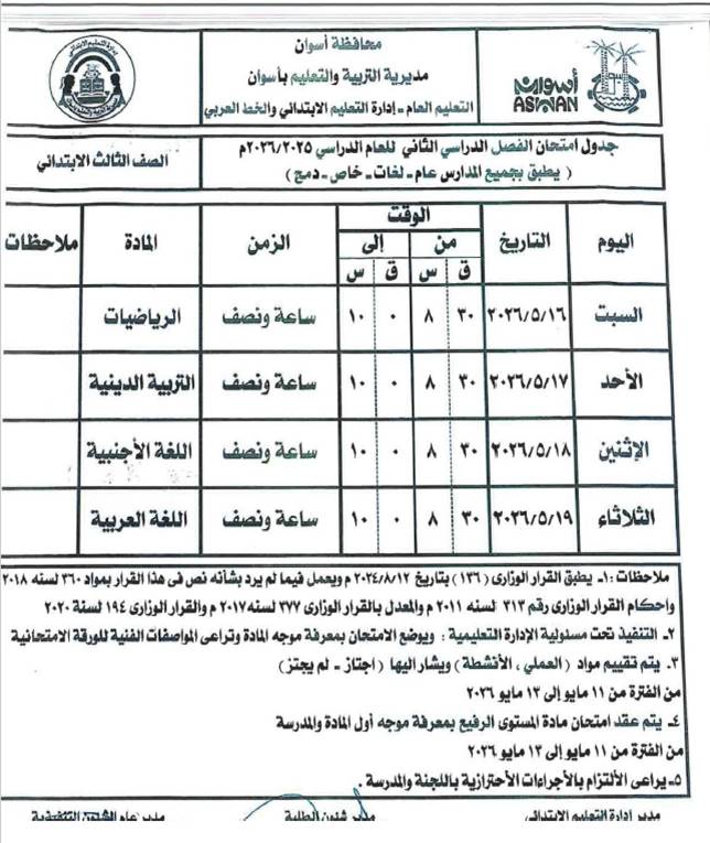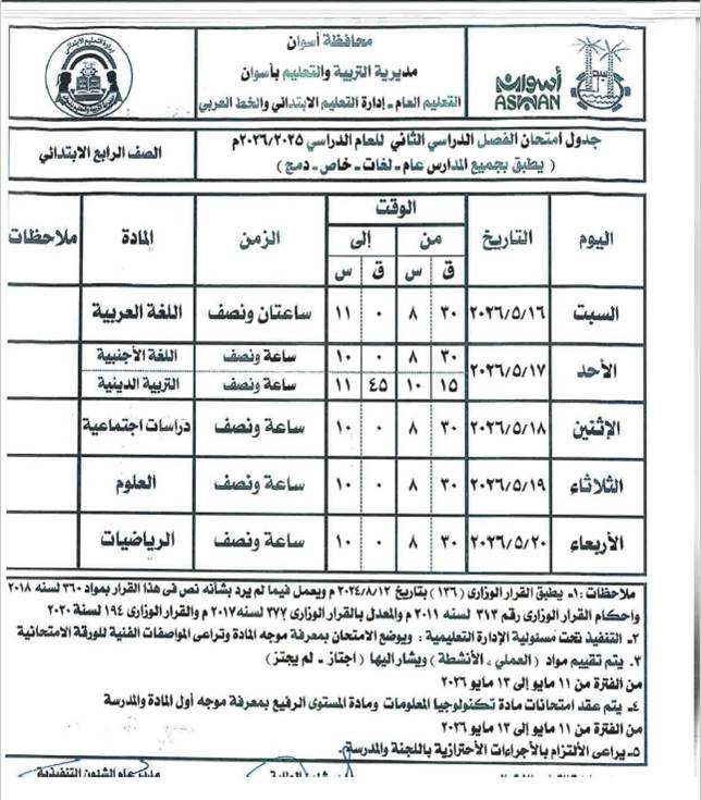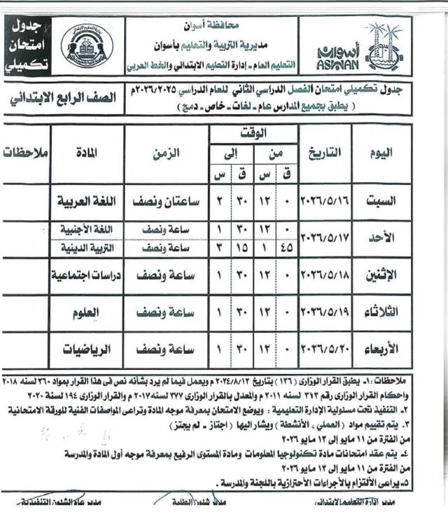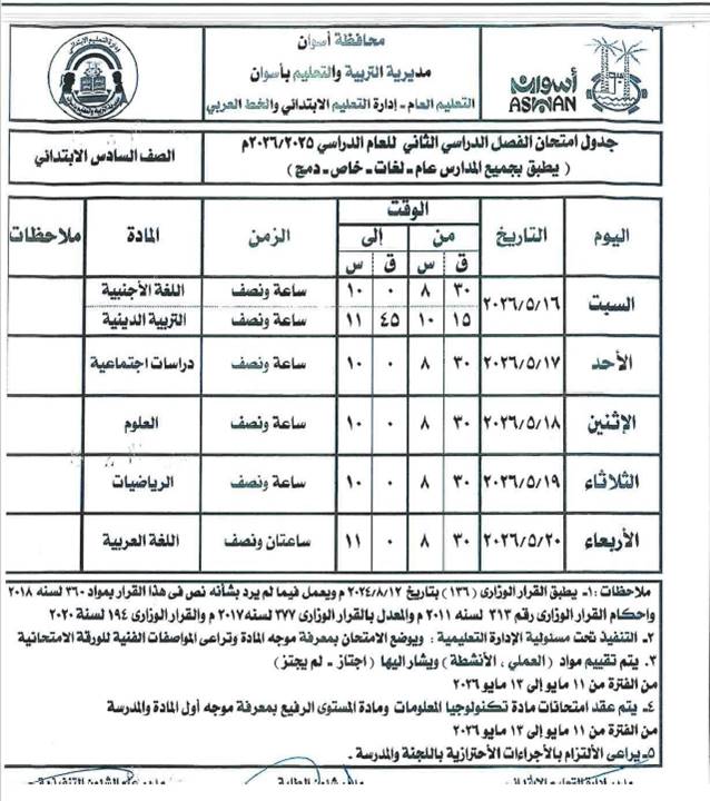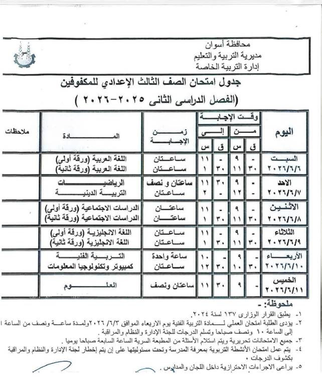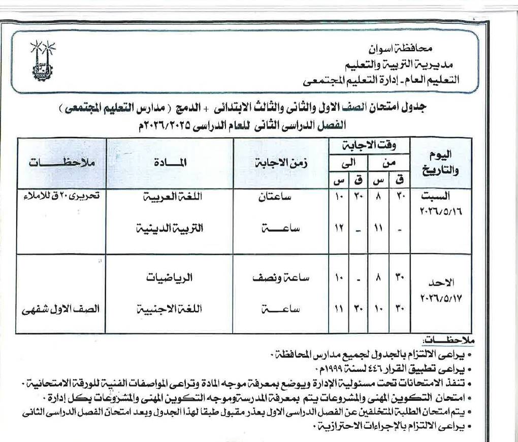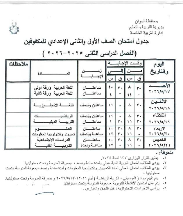 وشدد محافظ أسوان خلال إعتماده لخطة الإمتحانات على ضرورة تهيئة المناخ الملائم أمام الطلاب داخل اللجان، من خلال تكثيف أعمال النظافة العامة بمحيط المدارس، وتجهيز القوائم الإمتحانية بدقة، مع التأكد من توافر مبردات المياه، وتحسين وسائل التهوية والإضاءة، بما يضمن توفير بيئة مريحة وآمنة تساعد الطلاب على أداء إمتحاناتهم فى سهولة ويسر .