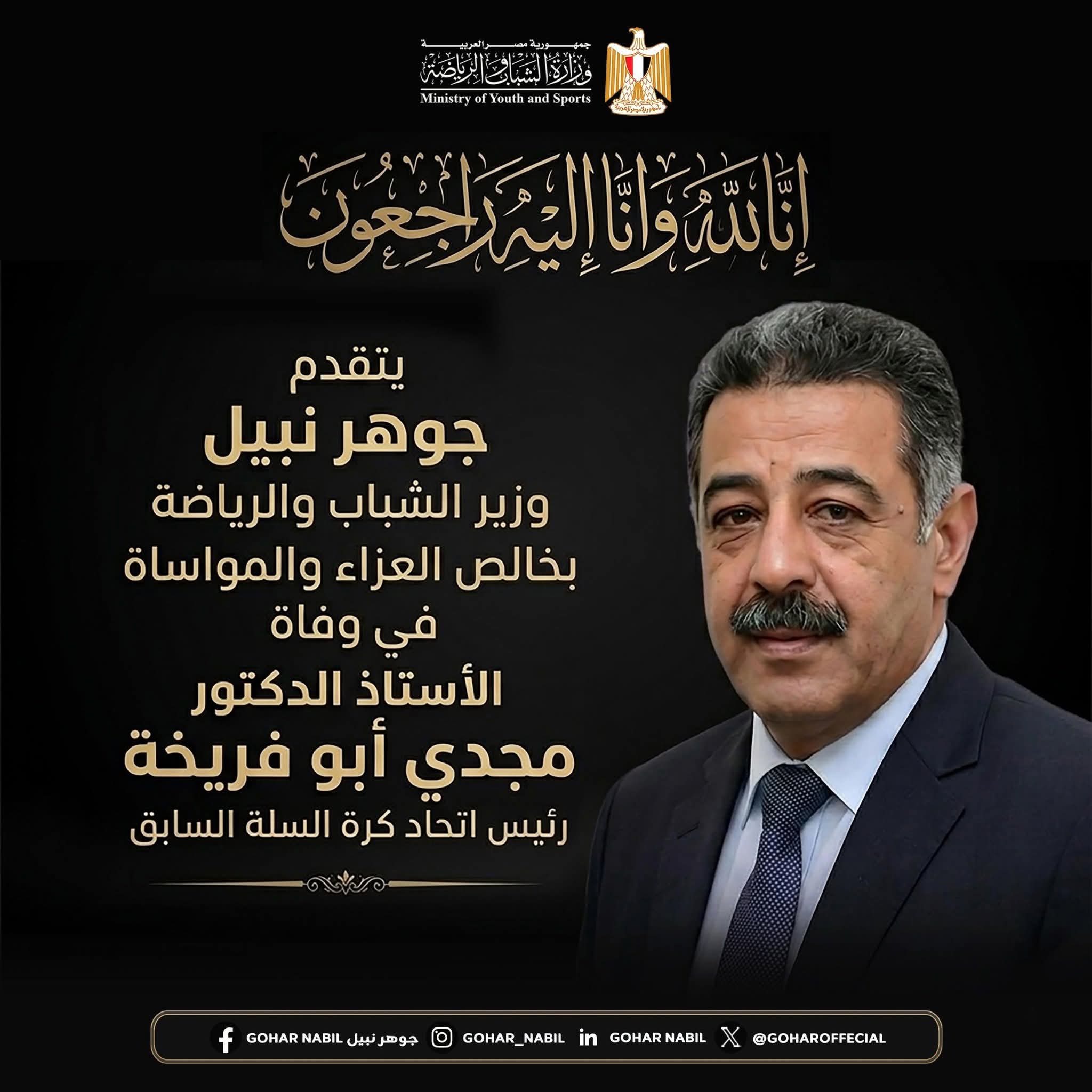 نعي نبيل جوهر وزير الشباب والرياضة الدكتور مجدي أبو فريخة، رئيس اتحاد كرة السلة السابق، وأحد رموز اللعبة، الذي توفي منذ قليل بكلمات مؤثرة