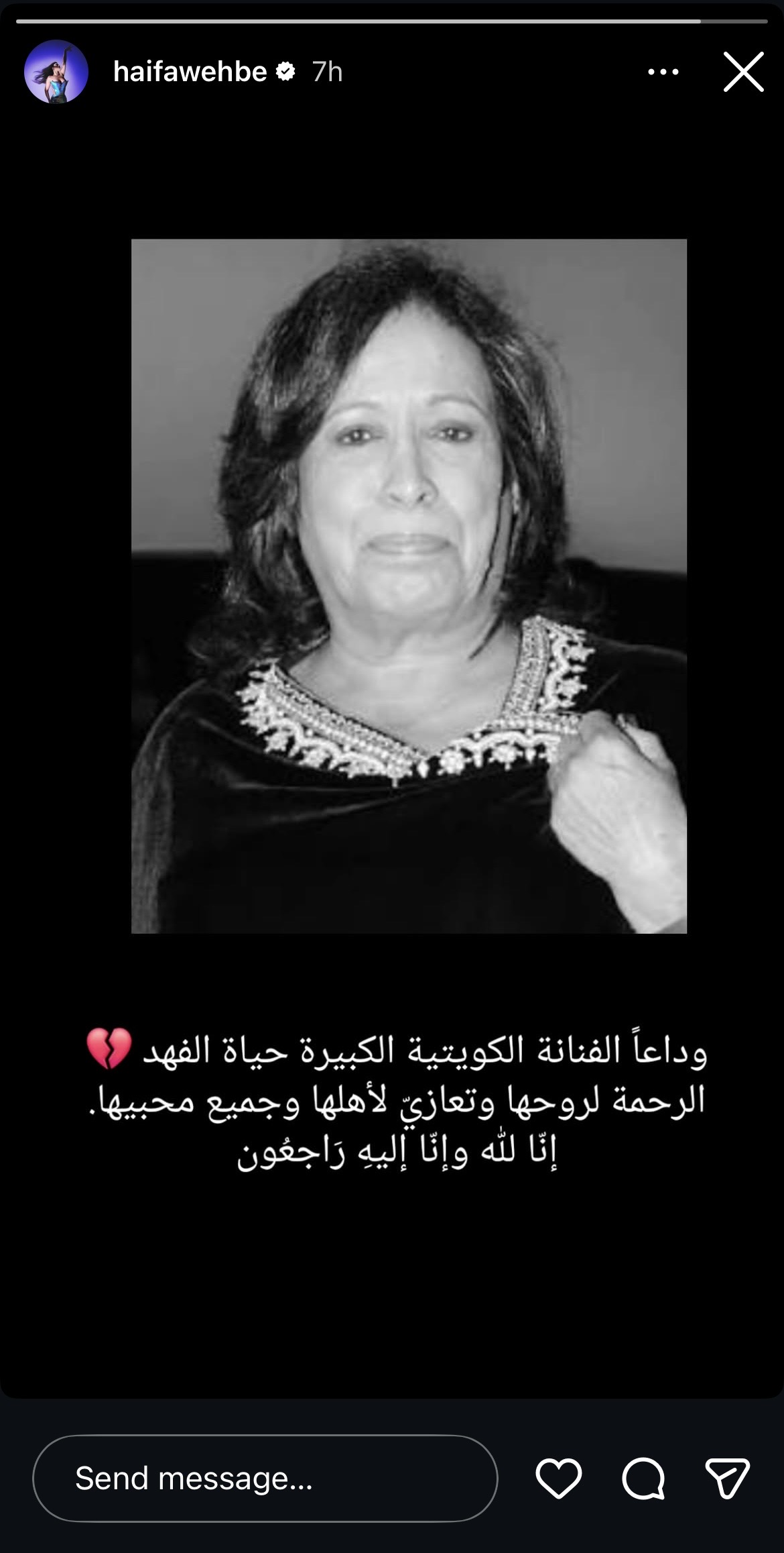 وكتبت هيفاء وهبي عبر ستوري انستجرام: “وداعًا الفنانة الكويتية الكبيرة حياة الفهد الرحمة لروحها وتعازي لأهلها وجميع مُحبيها”.