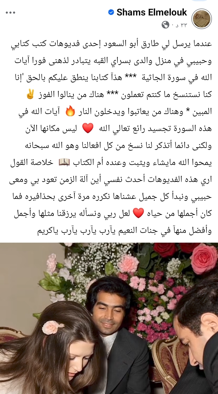 نشرت الفنانة المعتزلة شمس البارودي رسالة مؤثرة عبر حسابها على موقع «فيس بوك»، استرجعت خلالها ذكريات زواجها من زوجها الراحل الفنان حسن يوسف.