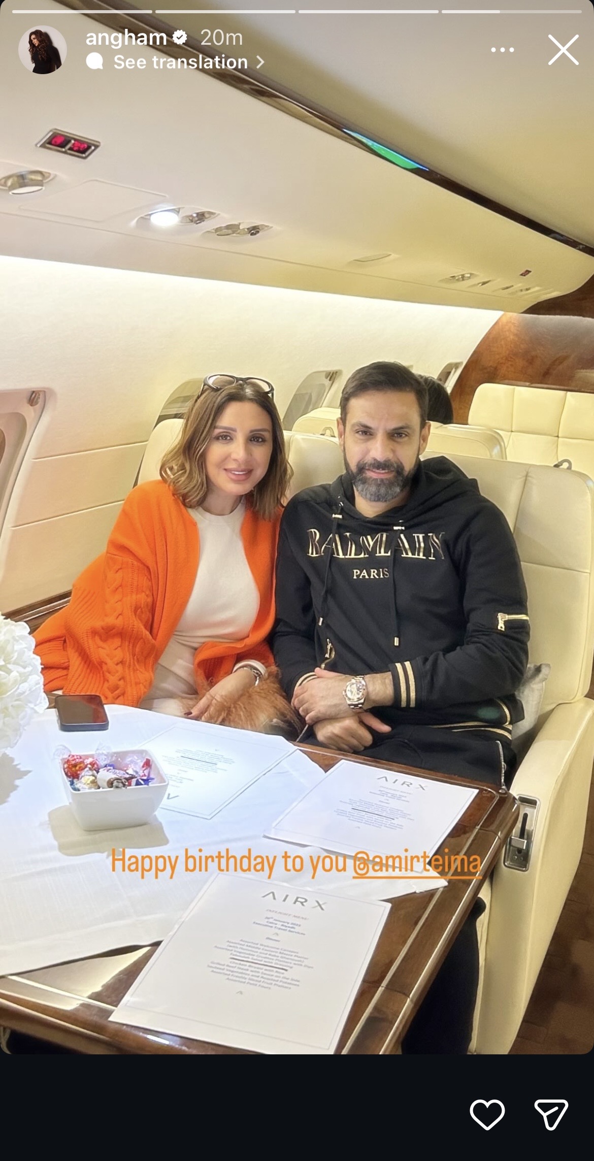 وكتبت أنغام على صورة تجمعها بأمير طعيمة من الطائرة: “عيد ميلاد سعيد”.