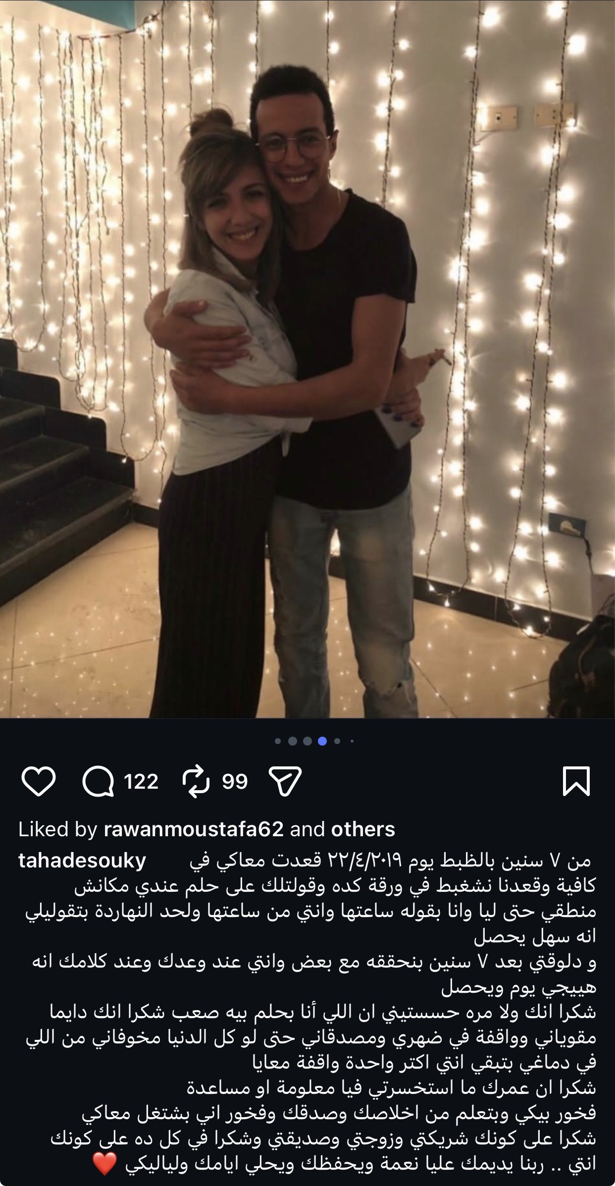 شارك الفنان طه دسوقي، متابعيه عبر حسابه على “إنستجرام”، منشورا مؤثرا، وجّه فيه كلمات خاصة لزوجته، استعاد خلالها بداية مشوارهما معًا قبل سنوات.
