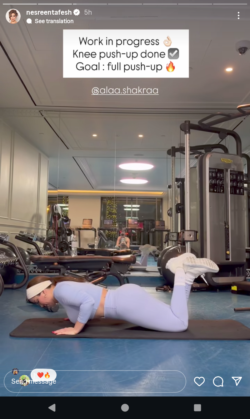 شاركت الفنانة نسرين طافش متابعيها إطلالة رياضية جذابة، عبر صفحتها على موقع التواصل الاجتماعي إنستجرام خلال خاصية الاستوري.