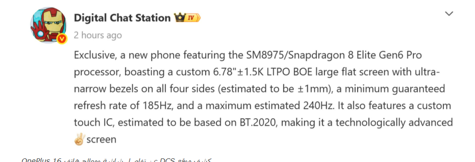 كشف موقع DCS عن تفاصيل شاشة ومعالج هاتف OnePlus 16 وبحسب التسريبات، قد يأتي هاتف OnePlus 16 بشاشة مسطحة جديدة من نوع BOE LTPO بحجم 6.78 بوصة ودقة 1.5K. ويُقال إن الشاشة تستخدم تقنية تغليف LIPO، مما يسمح بحواف رفيعة ومتناسقة للغاية من جميع الجوانب الأربعة، حيث يُقال إن سمكها يبلغ حوالي 1 مم .
